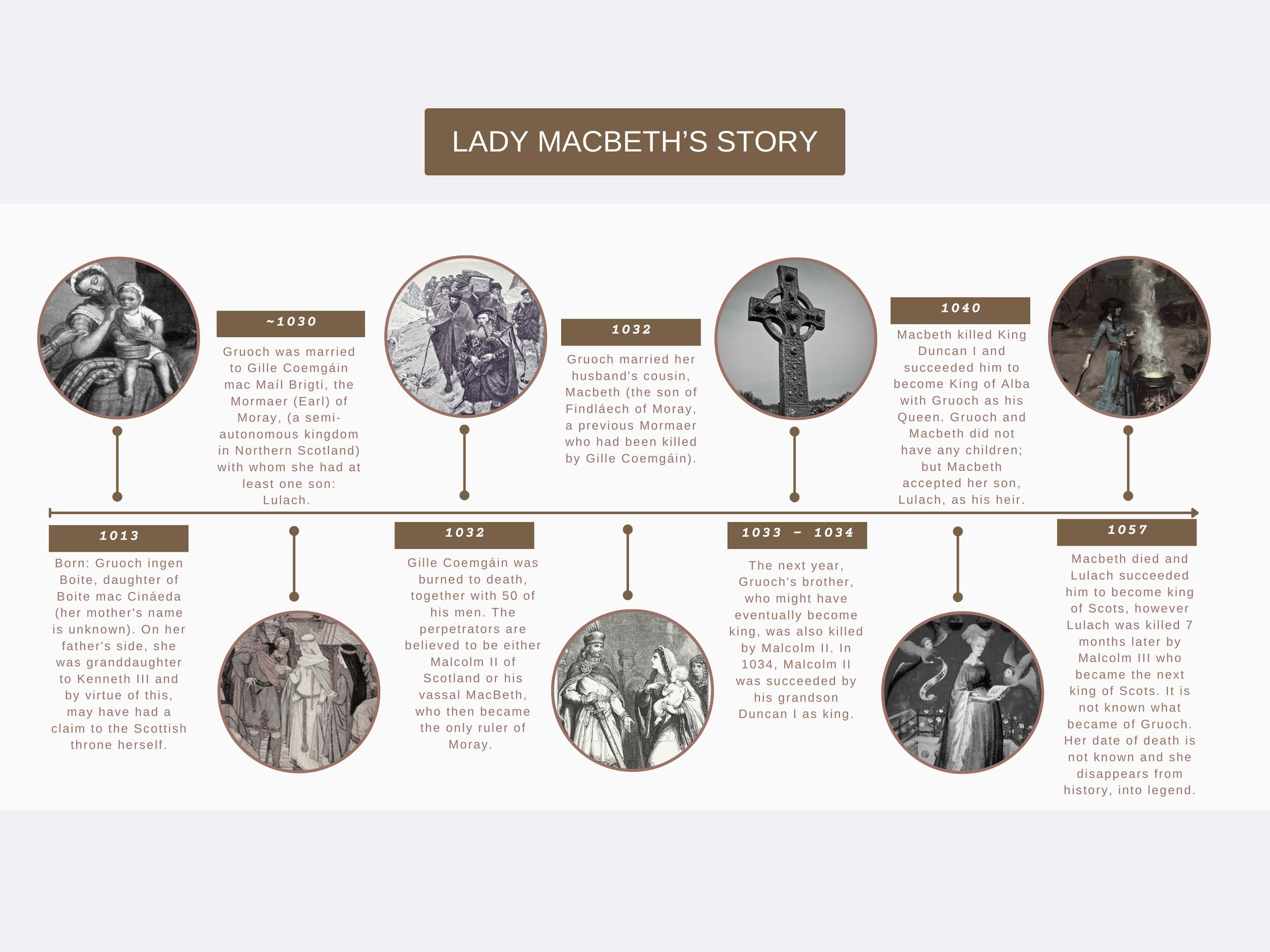 Would we think about her differently if we knew her real story? If we knew that Gruoch, which was her given name, was married before, and that many historians believe that Macbeth was responsible for her first husband’s murder? That she was left alone in the world with her young son, and would have had almost no other way to secure her son’s future and her own except to marry her first husband’s killer?